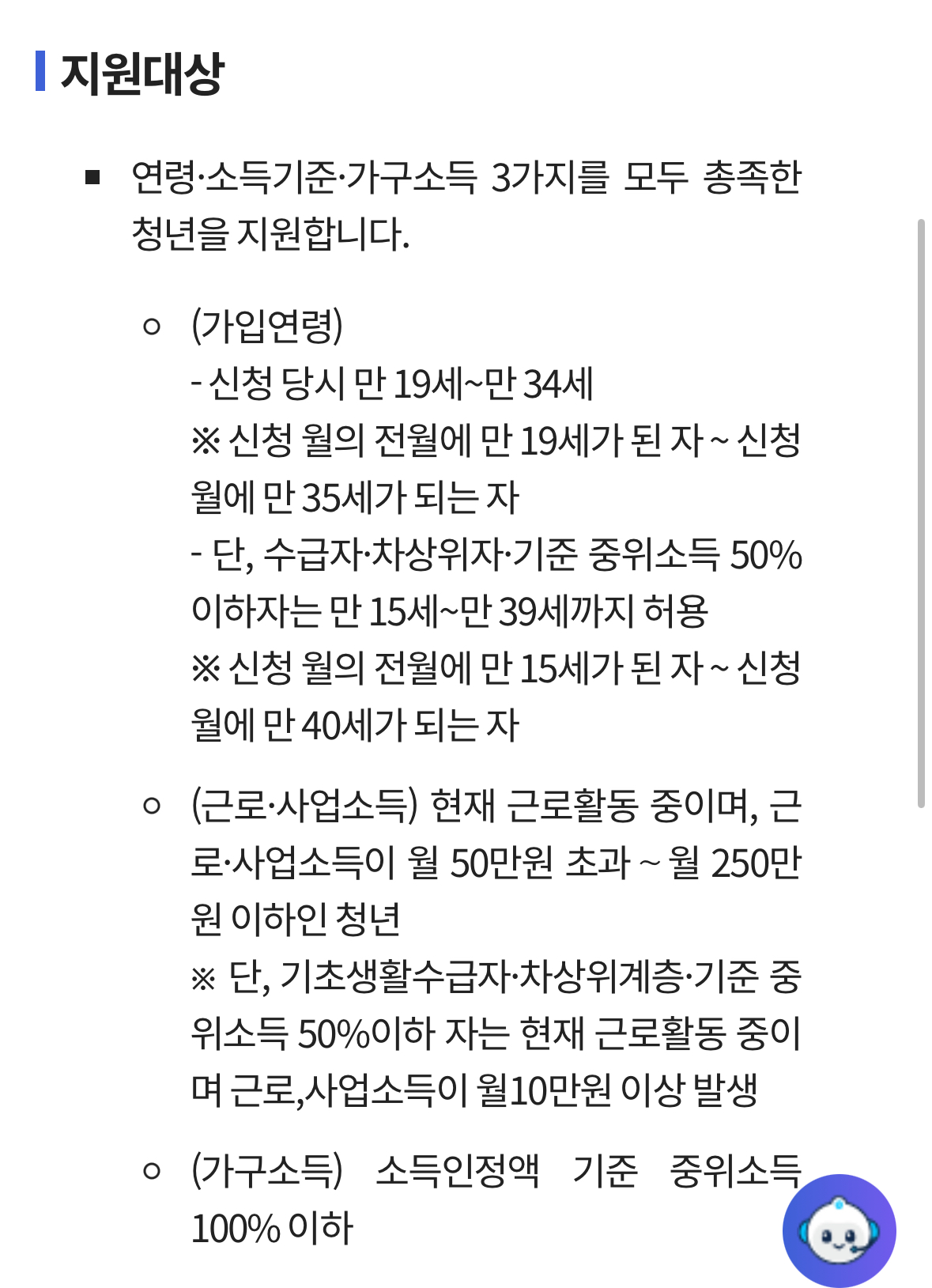 - 나이 조건: 신청 당시 만 19세~34세 (신청 월의 전월에 만 19세가 된 자~신청 월에 만 35세가 되는 자), 수급자 및 차상위 계층, 중위소득 50% 이하자는 만 15세~39세까지 가능