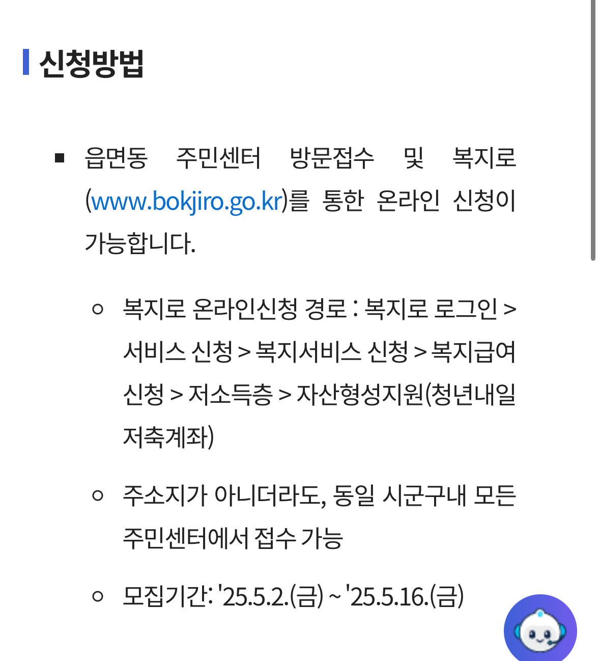 - 복지로 온라인 신청 경로: 복지로 로그인 (간편 가입 가능) > 서비스 신청 > 복지 서비스 신청> 복지 급여 신청> 저소득층> 자산형성지원(청년내일 저축계좌)