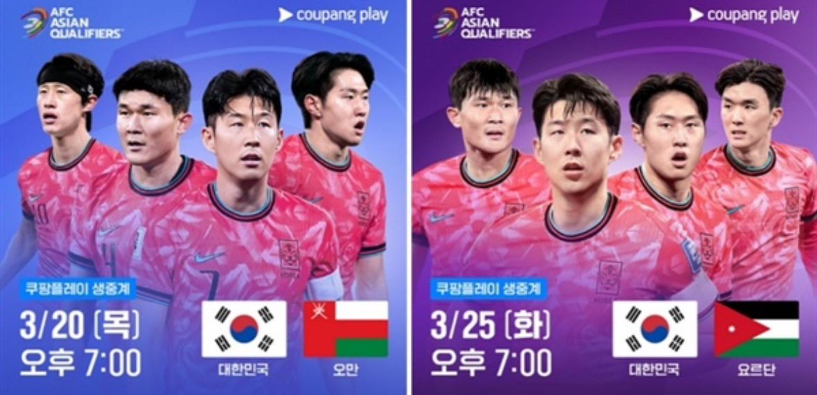 이번 오만, 요르단전은 모두 쿠팡 플레이를 통해서 무료로 시청이 가능합니다. 요즘 쿠팡 많이들 쓰시죠? 쿠팡 와우 멤버십만 있으시면 무료로 고화질의 생중계를 즐기실 수 있습니다.