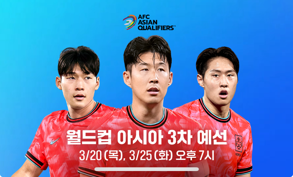 드디어! 3월 20일,25일에 2026 FIFA 월드컵 아시아 지역 3차 예선전을 진행합니다. 이번엔 오만, 요르단과 과 경기를 진행하게 되었는데요. 장소는 고양 종합운동장, 수원 월드컵 경기장에서 열리는데요. 저녁 8시니까 치킨과 함께 절대 놓치면 안 되는 경기겠죠. 아래에 무료 생중계 채널 정보 및 일정을 정리해 두었으니 참고하셔서 꼭 멋진 경기 함께 하시기 바라겠습니다.