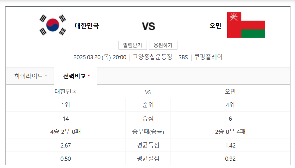 대한민국은 조 1위, 오만은 조 4위이며, 승점은 대표팀이 14점으로 더 앞서고 있습니다. 평균 득점도 대표팀이 2.67점, 오만이 1.42점으로 훨씬 더 유리한 위치에 있습니다.