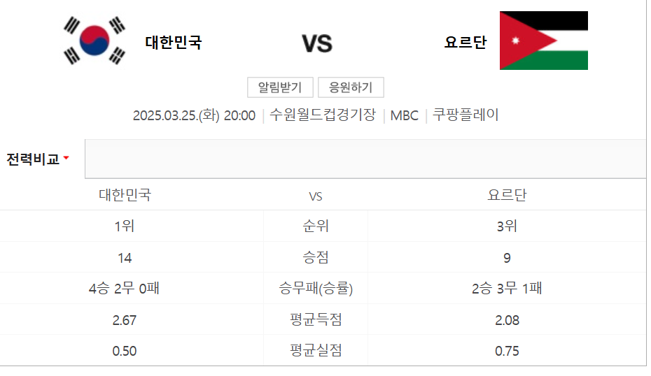 대한민국 대표팀은 조 1위, 요르단은 조 3위로 우리 대표팀이 우위에 있는 상황입니다. 평균 득점도 대표팀은 2.67점, 요르단은 2.08점으로 우리 팀이 유리한 위치에 있지만 경고 없이 압박을 적당히 하는 경기를 펼쳐야 하는 상황입니다.